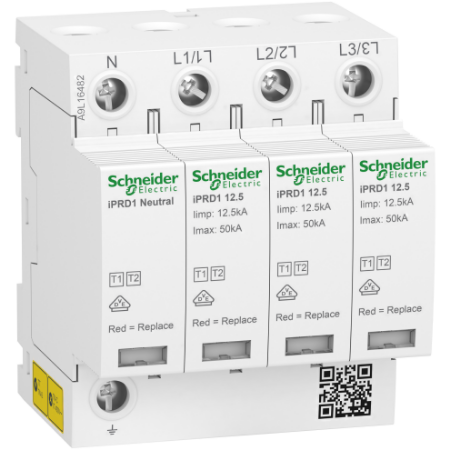 This Acti9 iPRD1 12.5r surge arrester protects 3P+N residential and small commercial buildings installations against direct and indirect transient overvoltages. This type 1+2 device autoprotected by an integrated circuit-breaker is recommanded for high risk level in incoming panel board. It offers remote reporting of the "cartridge must be changed" message. This prewired surge arrester allows quick replacement of withdrawable cartridges when they are damaged. It incorporates its end of life safety disconnector. This Acti9 iPRD1 12.5r is compatible with TT and TN-S earthing systems. Associated with Compact NSXm H TM80D the breaking capacity is 70kA. The Imax maximum discharge current is 50kA. The In nominal discharge current is 20kA. The Uc maximum continuous operating voltage in differential mode (between phase and neutral) is 350VAC. The Uc maximum continuous operating voltage in common mode is 255VAC between neutral and earth. The Up Voltage protection level is 1.5kV type 1+2. The Ue rated operational voltage is 230VAC or 400 VAC. The operating frequency is 50Hz. The dimensions are (W) 72mm x (H) 89mm x (D) 69mm. The width in 9mm pitches is 8. The weight is 619g. The degree of protection is IP20 and IP40 in modular enclosure. The operating temperature is -25°C to +60°C. The storage temperature is -40°C to +80°C. This product is complies with EN 61643-11 2012 and IEC 61643-11 2011 standards.
