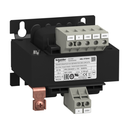 This ABL6 transformer supplies alternating current to control circuits while isolating them from mains power. It has a rated input voltage of 230V to 400V AC, a rated output voltage of 230V AC and a rated power of 40VA. It offers an economic way to supply each consuming load individually, or by groups of loads, in applications such as mining, refining. It is ideal for systems accepting low voltage AC power, such as motor protection relays, contactors.
