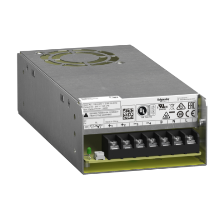 This Modicon ABLP regulated switch mode power supply (SMPS) supplies direct current voltage. It has a rated input of 100V to 240V AC, a rated output current of 10A at 24V DC and a rated power of 240W. It is ideal for supplying DC voltage necessary for automation equipment designed for applications in industrial, commercial and residential applications such as conveying, packaging, control, food & beverage, mining, oil & gas and water. It provides a protection against overloads and short-circuits with automatic restart after the source of overload/short-circuit has been corrected It has LED diagnostics indicator available in the front for troubleshooting instantly. Its width is 190mm, its height is 50mm, its depth is 93mm. It weighs 0.850kg. It is certified with CB-Scheme, cULus Listed, cURus recognized, RCM and EAC. It is a power supply for commercial use, panel mount; It is compatible with ABLPA02 mounting plate. It installs on panel on side or on base with mounting plate fixing by screw. ABLP power supplies bring energy to your automated systems. ABLP power supplies are designed for simple and repetitive machines, dedicated power supplies are particularly quality/price competitive due to their simplicity and compactness. The main applications to use Modicon ABLP power supply are lifts, display panels, escalators, carwash, foodstuff ovens, etc.