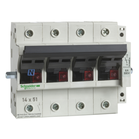 TeSys GK fuse carrier block, 4 poles (4P), for protection of motors and transformers up to 50A/690V. To be used with 14x51mm fuse links up to 50A. It provides a front handle, 1NO early break auxiliary contact. It can be used in modular panels, clipping on 35mm DIN rail, connection by screw terminals. Fuse links (14x51mm aM, gG type) and add-on auxiliaries (tubular links for Neutral, side handle operators, padlocking devices) are available (to be ordered separately). Multi standards certified (IEC, EN, Marine), it conforms to RoHS/REACh regulation.