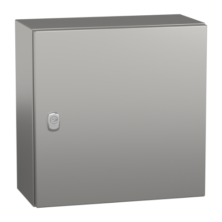 Spacial S3X stainless steel 304L wall-mounting enclosure for a multi-purpose application and resistance to corrosion It is designed for use in harsh environments, it can withstand high impact due its IK10 (IEC62262) and it has a high resistance to dust and water with an IP66 rating (IEC60529) This enclosure has a nominal height, width and depth of 400mm, 400mm and 200mm respectively The enclosure is made with Scotch-Brite® brushed surface finish The enclosure consists of a body, a plain door and a lock The door can be opened up to 120°, allowing easy access to the equipment inside It is possible to change the opening side of the door (reversible) The door has a 3mm double-bar lock insert The door can be removed for maintenance purposes The net weight of the enclosure is 6,698kg