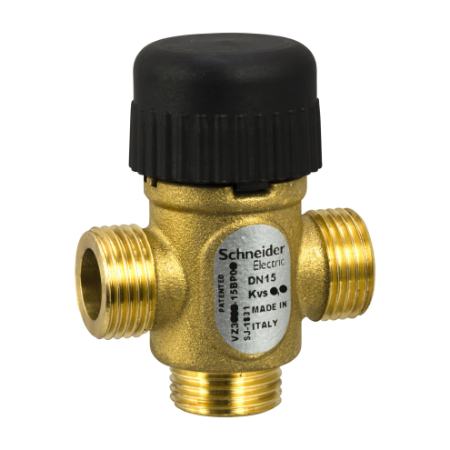 The VZ38E is a small linear three-way zone valve used for the control of hot or chilled water in terminal units. It is designed to be used with the MZ14 family of thermal actuators. The valves utilise a double O-ring design on the plug to ensure a leak tight seal on both valve ports, this ensures no loss of energy leakage through the valve. The valve is BSP male threaded valves with flat face seals, a range of connection sets are available to mate onto pipe. Size DN 15, G1/2A connection, 1.6 Kvs. Pressure class PN16, stroke 2.5 mm, Normally closed (A-Ab). External thread to ISO 228/1 (flat face seal).