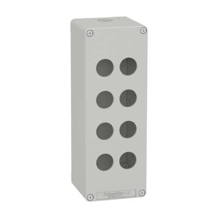 This product is part of XAP range, an offer of metal control stations for XB4 and XB5 series of Ø 22mm pushbuttons. XAPD4508 is an empty enclosure with grey color (RAL7035). This version with 8 holes allows combination of XB4/XB5 functions in a small volume. Its dimension leaves a comfortable space for wiring. It is possible to customize the XAP with the Harmony online product selector and configurator. This product has been standardized with metric thread to be used with ISO cable glands to be fully compliant with the IEC 62444. It comes with two M25 holes. The electric shock protection is at class I conforming to EN/IEC 61140 and the mechanical shock protection level is up to IK07 conforming to EN/IEC 62262. This is a zinc alloy offer and the dimensions are 80mm (width) x 220mm (height) x 77mm (depth) and it weighs 1.370kg. XAPD is designed for Original Equipment Manufacturers (OEMs) that meets heavy duty application requirements such as material handling, food & beverage, wind turbines, Mining, Minerals and Metals (MMM), vehicles, etc. This enclosure complies with EN/IEC 60529 and EN/IEC 60947-5-1 and comes with CE and EAC certification. Fully customized legend panel are available to improve interface experience and enclosure's aesthetic. XAP is designed to be mounted in both vertical and horizontal position with 4 fixing holes. The form factor allows a combination between simplicity, customization flexibility and attractive design for machines It is eco-friendly and complies with directives such as RoHS, WEEE and REACh relating to environmental protection.